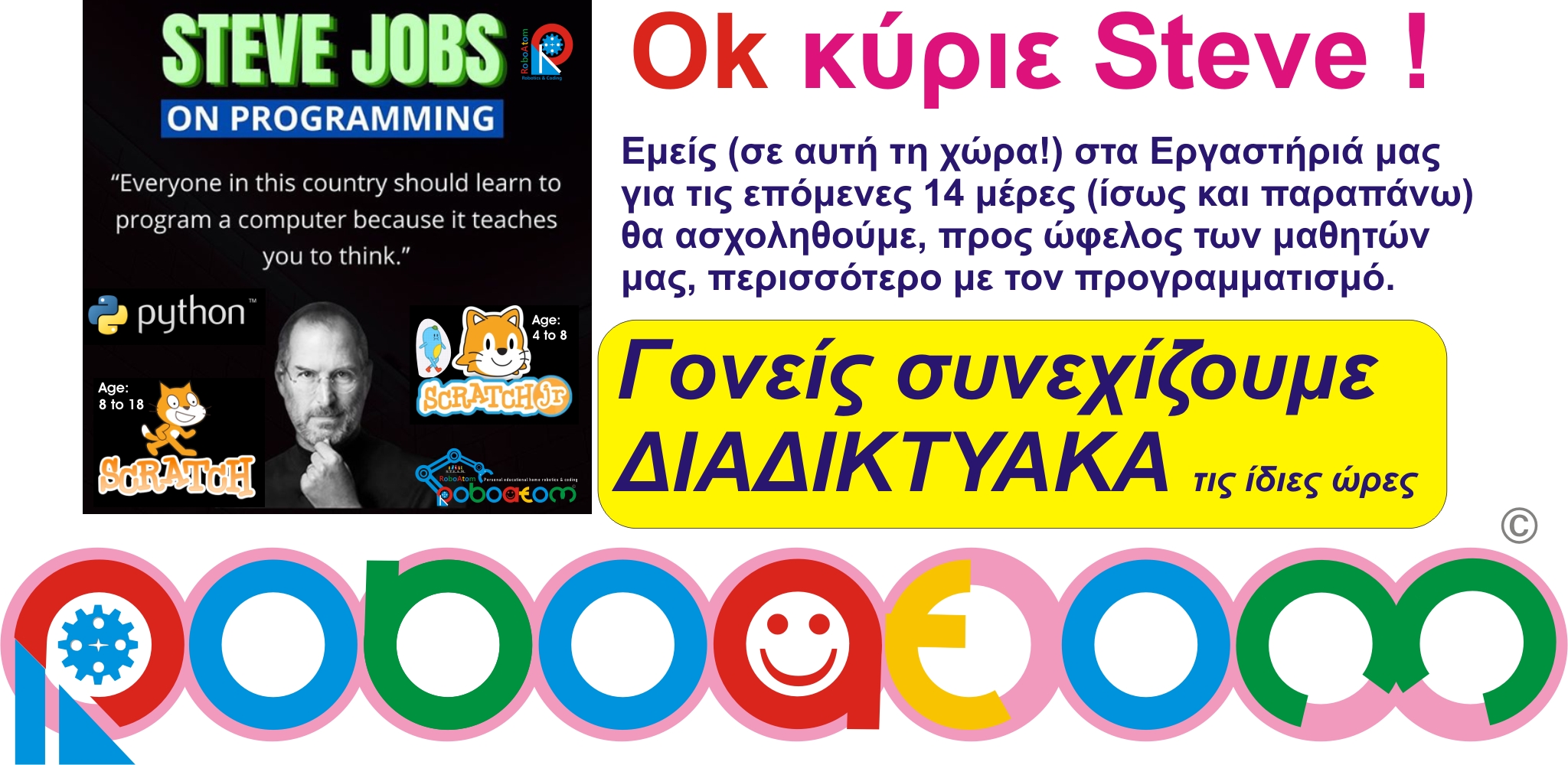 Συνεχίζουμε με ΤΗΛΕΔΙΑΣΚΕΨΕΙΣ με τέτοιο τρόπο ώστε να βγουν κερδισμένοι οι μαθητές μας και θα είναι κερδισμένοι διότι θα ασχοληθούμε πολυ με προγραμματισμό. (4 ώρες με ΤΗΛΕΔΙΑΣΚΕΨΗ και 2 Ασκήσεις-κατασκευές στο σπίτι με το βαλιτσάκι-Lego ρομποτικής)